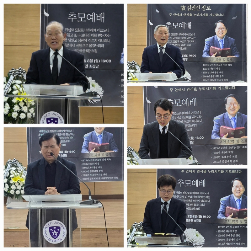 고 김진건 장로님은 강서대학교 초대 총장과 학교법인 이사장을 역임하며, 대학이 종합대학으로 성장하는 데 중요한 역할을 수행했다. 교육기관의 체계와 방향을 정립하는 데 힘쓴 그는 후학들을 위한 기반을 구축하며 대학 발전에 크게 기여한 인물로 평가받고 있다.