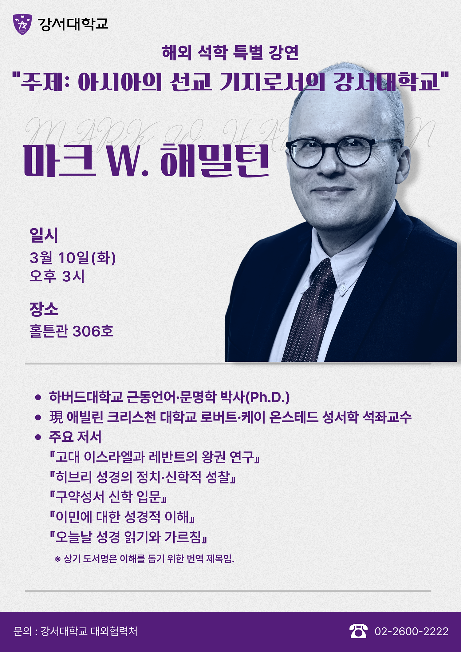 3월 10일 화요일 오후 3시 강서대학교에서 “아시아 선교 모델 연구”를 위한 공개 강의를 갖습니다.